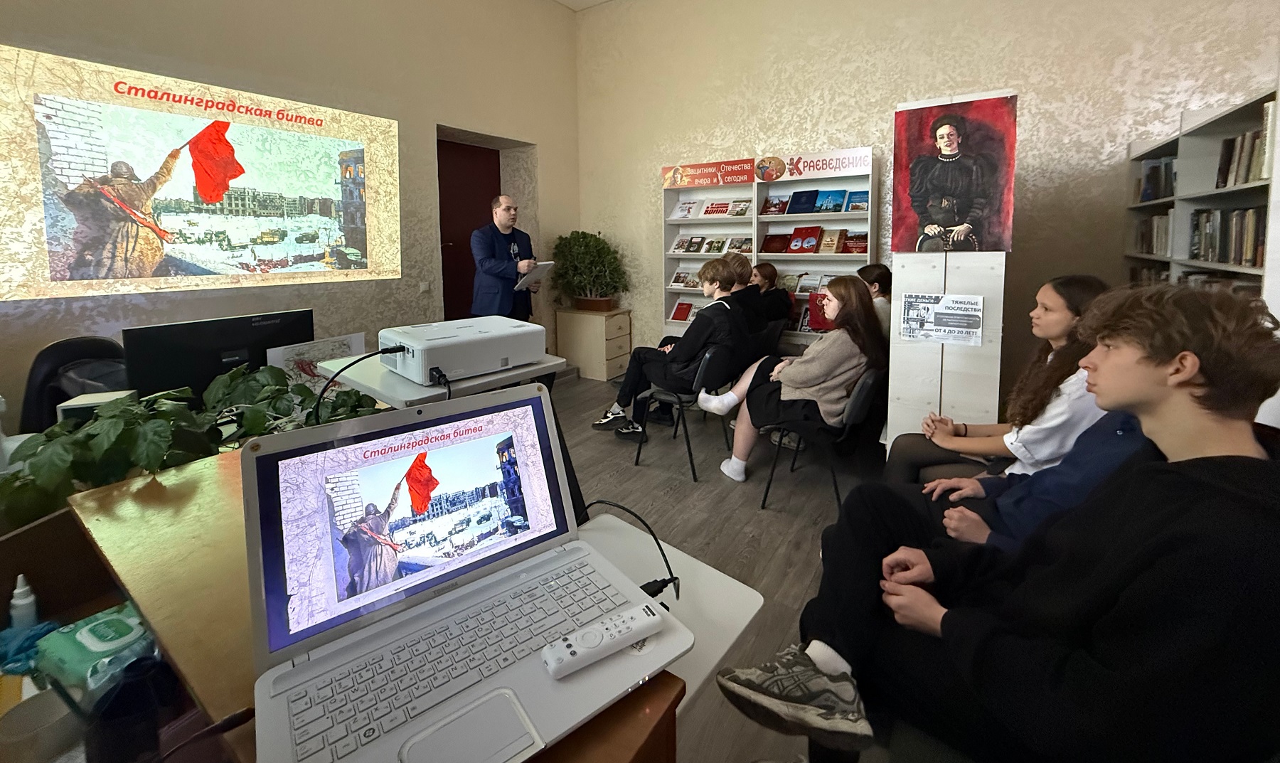 Сотрудник МЦБ поселка Каменоломни Валерий Гончаров провел тематическое мероприятие «Сталинград: завещано помнить» для учащихся 11 класса гимназии № 20. Встреча состоялась в читальном зале библиотеки.