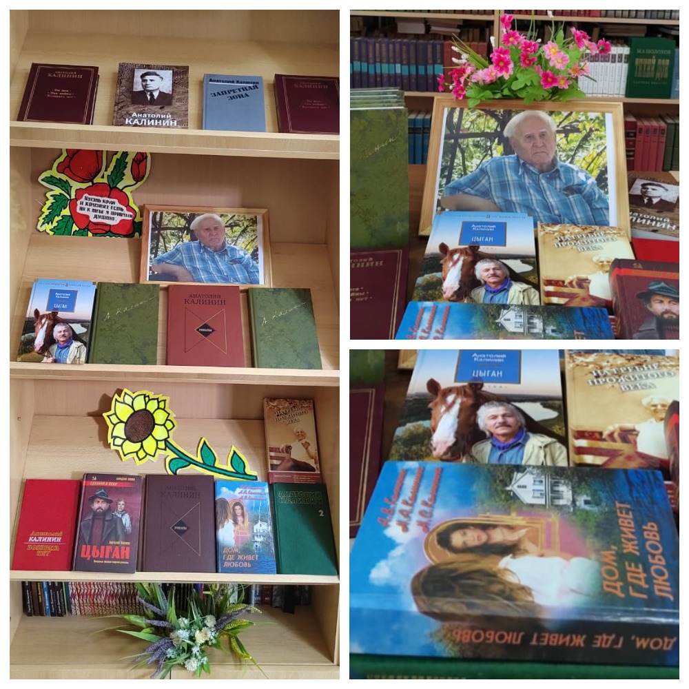 22 августа исполняется 106 лет со дня рождения донского писателя Анатолия Вениаминовича Калинина. В читальном зале Межпоселенческой центральной библиотеки поселка Каменоломни к этому событию приурочена книжная выставка под названием «И разум и сердце – краю родному». На выставке представлены: роман «Запретная зона», посвященный строительству Волго-Донского канала. Былые картины прошедшей войны оживают в повестях «Эхо войны» (1963), «Возврата нет» (1971). Роман «Гремите, колокола» - о юной любви вышел в 1967 году, Собрание сочинений Анатолия Калинина в четырех томах. В это издание, помимо прозаических произведений писателя, включены его стихи и поэма. Самый известный роман А. В. Калинина «Цыган» выдержал более десяти изданий, три экранизации, переведен на многие языки мира. На его основе создано несколько театральных постановок, написана романтическая опера, а его герои стали поистине народными. «Ни одно из своих произведений Калинин не писал с такой страстной и беззаветной самоотдачей, как свой роман о Клавдии и Будулае», - вспоминает дочь писателя Наталья Калинина.