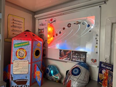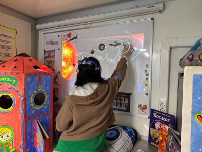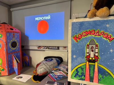 Познавательная беседа об истории освоения космоса, подготовленная сотрудниками библиотеки, гармонично сочеталась с творческими заданиями. Ребятам-«космонавтам» было предложено с помощью мимики и жестов объяснить понятия земного мира воображаемым инопланетным существам, правильно расположить планеты Солнечной системы на интерактивной доске, разгадать головоломки на космическую тематику и выполнить ряд других интересных упражнений.